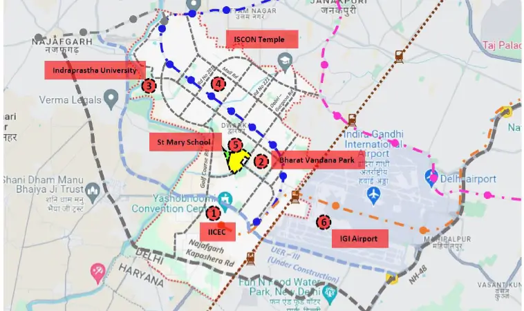 The Omaxe State Dwarka is strategically located in Sector 19B, Delhi, with excellent connectivity to Dwarka Metro, major arterial roads, and nearby residential and commercial hubs, ensuring accessibility for businesses and customers.
